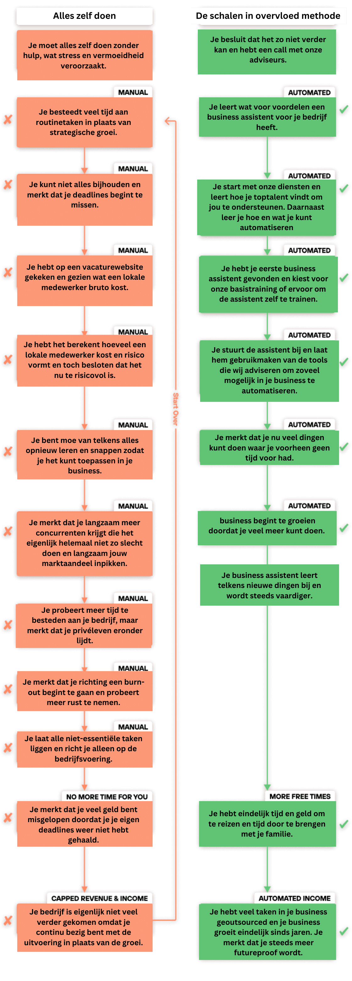 Het voordeel van alles zelf doen is dat je volledige controle hebt en geen extra personeel hoeft in te huren. Maar de nadelen zijn aanzienlijk: het kost enorm veel tijd, je moest vaak taken doen waar je niet goed in bent of geen tijd voor hebt, en je loopt continu tegen je eigen beperkingen aan, tot een burn out aan toe. Het resultaat: Stagnatie van je bedrijf!