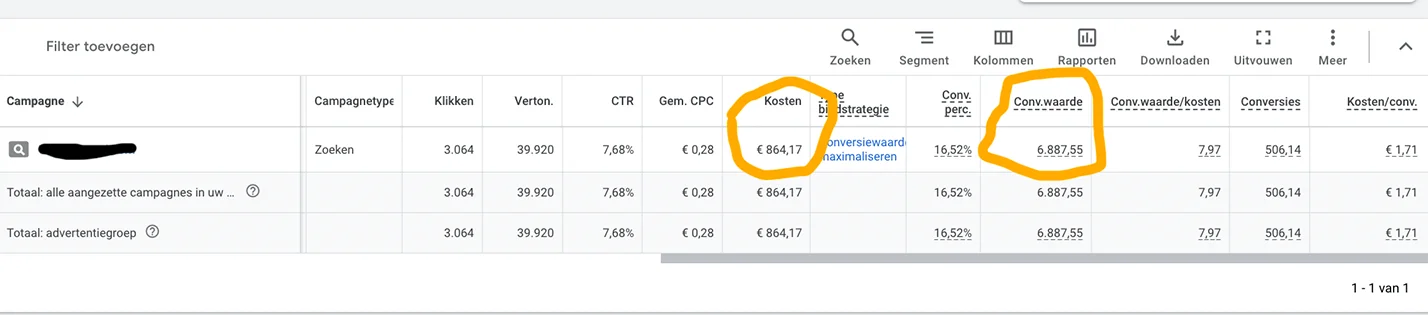 Zoals je kunt zien hebben we €864,17 in onze Assistent gespecialiseerd in ads onze ads laten optimaliseren en hier €6887,55 omzet aan overgehouden. Dit is een ROI van bijna 800%!!