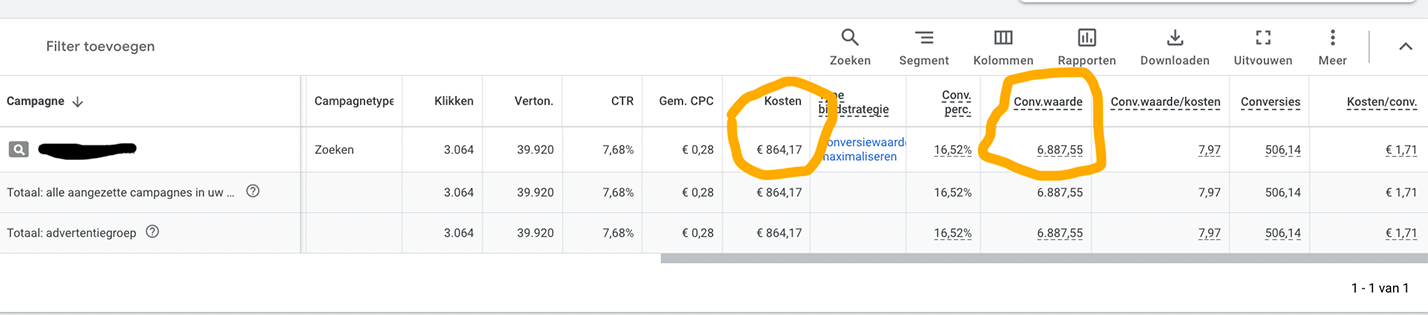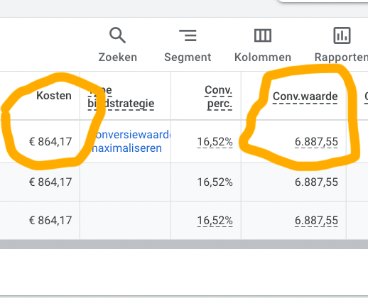 Zoals je kunt zien hebben we €864,17 in onze AI geoptimaliseerde ads geïnvesteerd en hier €6887,55 omzet aan overgehouden. Dit is een ROI van bijna 800%!!