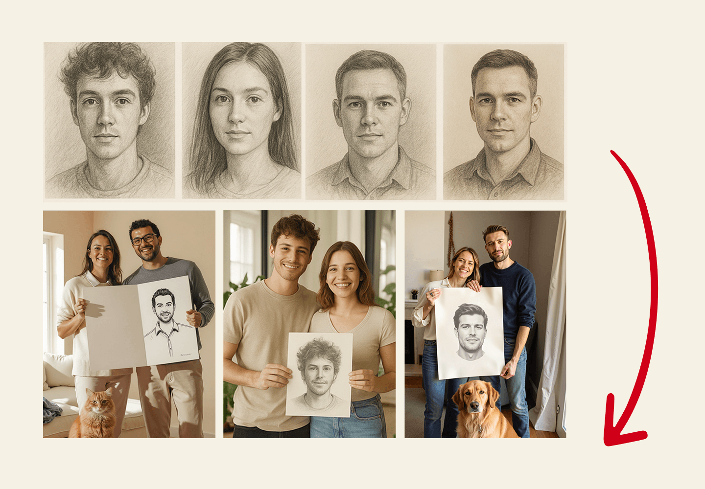 Elke schets is uniek, getekend met zorg en intuïtie. Hier zijn slechts enkele van de vele portretten die al harten hebben geraakt over de hele wereld.